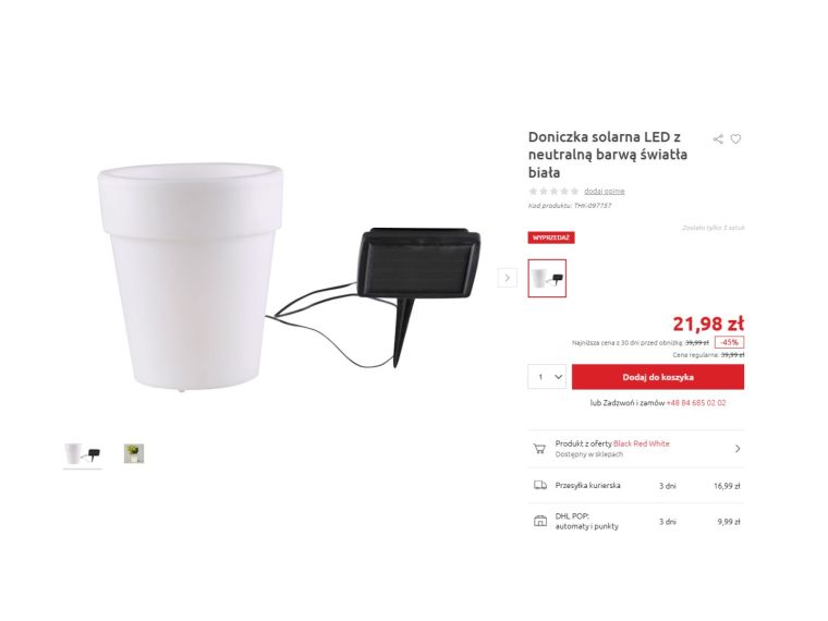 Największe zaskoczenie pojawia się dopiero przy cenie. Tego typu świecące donice w sklepach z wyposażeniem ogrodu potrafią kosztować nawet kilkaset złotych. Tutaj trafiła się prawdziwa okazja. Na wyprzedaży można ją kupić za 21,98 zł, czyli prawie o połowę taniej niż wcześniej.