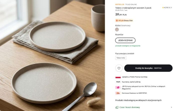 Szukałam więc dalej, ale miałam już w głowie estetykę, jaka mnie interesowała, więc było jeszcze bardziej pod górkę. Mocno się zdziwiłam, jak niemal identyczny talerz znalazłam w Sinsay i to w zestawie. Regularna cena za dwa talerze o średnicy 27 cm to 39,99 zł, czyli prawie tyle samo, co w Homli za jeden. Ja miałam jeszcze o tyle szczęścia, że dorwałam je na wyprzedaży jakoś za niecałe 30 zł. Oczywiście od razu wzięłam dwa komplety.
