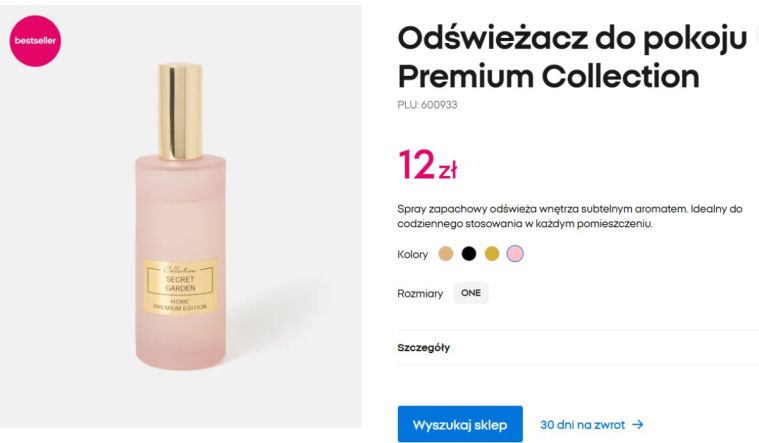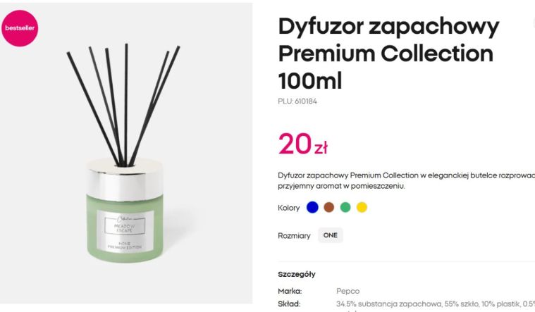 Jeżeli lubicie pachnące patyczki do pomieszczeń, koniecznie wypróbujcie bestseller Pepco, czyli dyfuzor z serii Premium Collection. Jest duży i pojemny, dzięki czemu zapach utrzymuje się długo i jest intensywny, a sam dyfuzor ze złotymi elementami prezentuje się bardzo elegancko. Kosztuje 20 zł, a do wyboru mamy 4 kompozycje zapachowe: „Floral Sweetness”, „Poached Peach Tart”, „Dark Chocolate” oraz „Meadow Escape”.