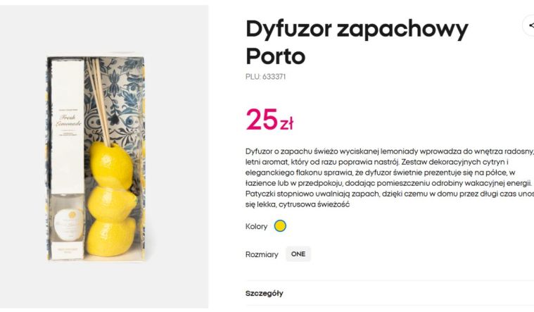 W Pepco na dziale z zapachami do domu znajdziemy bardzo ciekawy dyfuzor zapachowy Porto w kształcie… cytryn. 3 kamionkowe „ cytryny”, które wyglądają jak prawdziwe, są ustawione jedna na drugiej. Do środka wlewa się dołączony do zestawu cytrynowy zapach i wkłada drewniane patyczki. Już po chwili aromat unosi się w całym pomieszczeniu – jest świeży, lekki, idealny na lato.