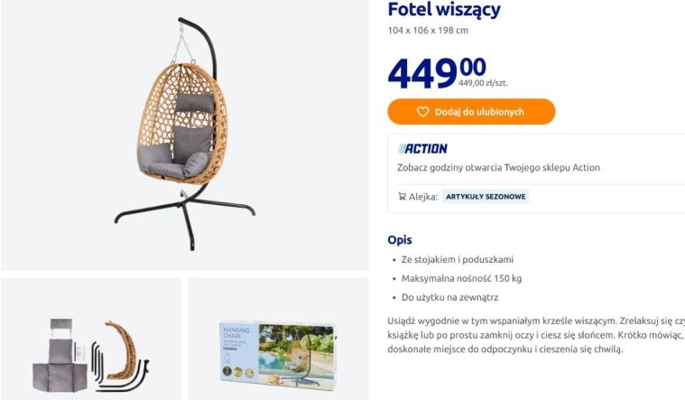 W ofercie Action pojawił się fotel wiszący, który na pierwszy rzut oka przypomina modele z dużo droższych sklepów wnętrzarskich. To tzw. kokon – siedzisko w formie ażurowej kuli, zawieszone na stabilnym stelażu, które od razu kojarzy się z relaksem i letnim klimatem. W zestawie znajdują się także miękkie poduszki, dzięki którym można wygodnie usiąść, zanurzyć się w fotelu i naprawdę odpocząć. Całość prezentuje się bardzo stylowo i pasuje zarówno do nowoczesnych balkonów, jak i bardziej naturalnych, ogrodowych aranżacji.
