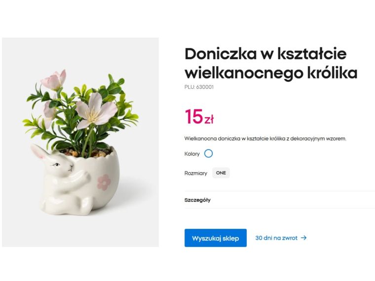 Warto zwrócić uwagę także na wazon ceramiczny S za 12 zł. Ma romantyczny, niewielki design i subtelne tłoczenia z motywem roślinnym. Świetnie sprawdzi się jako oprawa dla pojedynczych tulipanów, gałązek eukaliptusa czy suszonych traw. W sezonowej ofercie pojawiła się także doniczka w kształcie wielkanocnego królika za 15 zł – urocza, dekoracyjna i idealna jako element wiosennej stylizacji stołu.