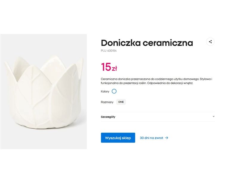 Równie interesująca jest doniczka ceramiczna o rzeźbiarskiej formie przypominającej rozchylone płatki kwiatu – również w cenie 15 zł. Jej minimalistyczna, biała bryła wpisuje się w estetykę skandynawską i modern farmhouse. To idealna baza dla zielonych roślin o mięsistych liściach, takich jak zamiokulkas czy monstera w wersji mini.
