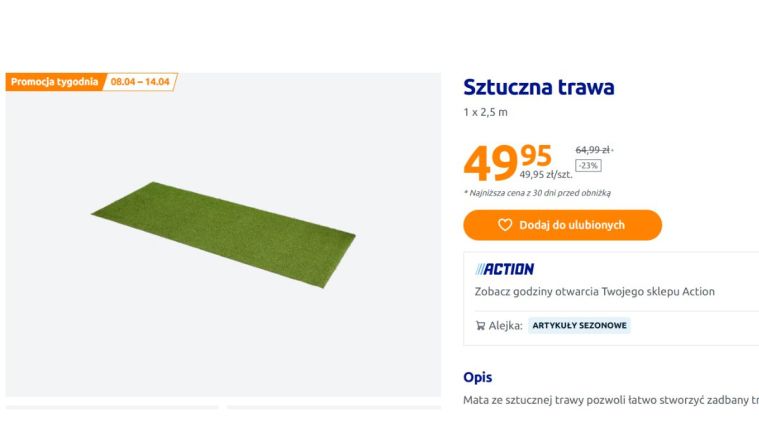 W ofercie Action pojawiła się sztuczna trawa, która szybko przyciąga uwagę osób szukających prostych rozwiązań na balkon. To mata o wymiarach 1 x 2,5 metra, która pozwala w kilka chwil stworzyć efekt zielonej, zadbanej przestrzeni bez konieczności pielęgnacji. Aktualnie produkt objęty jest promocją tygodnia – od 8 do 14 kwietnia można kupić go za 49,95 zł, podczas gdy wcześniej kosztował 64,99 zł, co oznacza obniżkę o 23%.