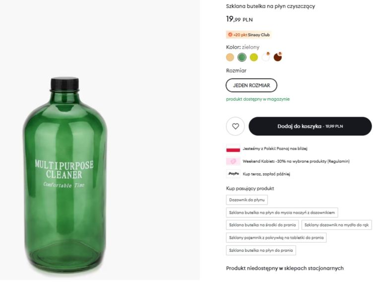 Jedną z najciekawszych nowości są zielone szklane butelki inspirowane stylem retro. Mają minimalistyczny wygląd i subtelne napisy, dzięki którym od razu wiadomo, co znajduje się w środku. W ofercie Sinsay pojawiła się między innymi szklana butelka na płyn czyszczący z napisem „Multipurpose Cleaner”. Kosztuje 19,99 zł i świetnie sprawdzi się do przechowywania uniwersalnych środków do sprzątania. Dzięki niej detergent nie stoi już w krzykliwym plastikowym opakowaniu, tylko w eleganckiej butelce przypominającej te z designerskich sklepów.