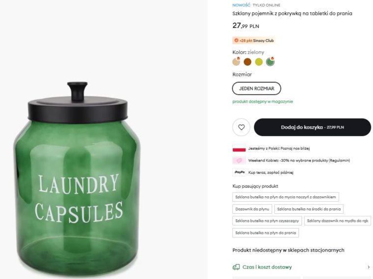 Kolejną ciekawą nowością z oferty Sinsay jest szklany pojemnik na kapsułki do prania z napisem „Laundry Capsules”. To duży, zielony słoik z czarną pokrywką, który bardziej przypomina stylową dekorację niż zwykłe pudełko na detergent. Kosztuje 27,99 zł, a dzięki szerokiemu otworowi bardzo łatwo sięga się po kapsułki podczas prania.