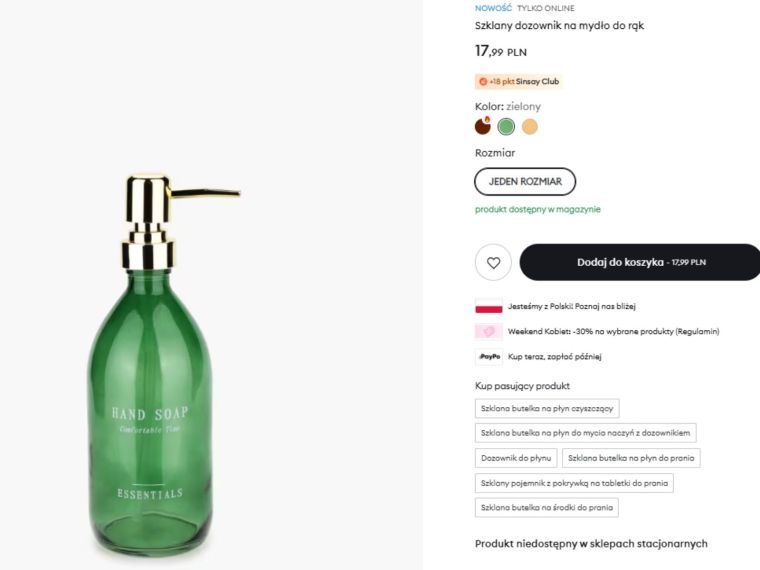 W podobnej stylistyce dostępna jest także butelka na płyn do prania z napisem „The Laundry Detergent”, również w cenie 19,99 zł. Zielone szkło wygląda bardzo stylowo, a jednocześnie pasuje do wielu wnętrz – zarówno nowoczesnych, jak i bardziej klasycznych. Do kompletu można dobrać szklany dozownik na mydło z metalową pompką. Ten model kosztuje 17,99 zł i z powodzeniem może stać przy umywalce w łazience lub przy zlewie w kuchni. Całość tworzy spójny zestaw, dzięki któremu nawet codzienne środki czystości wyglądają estetycznie.