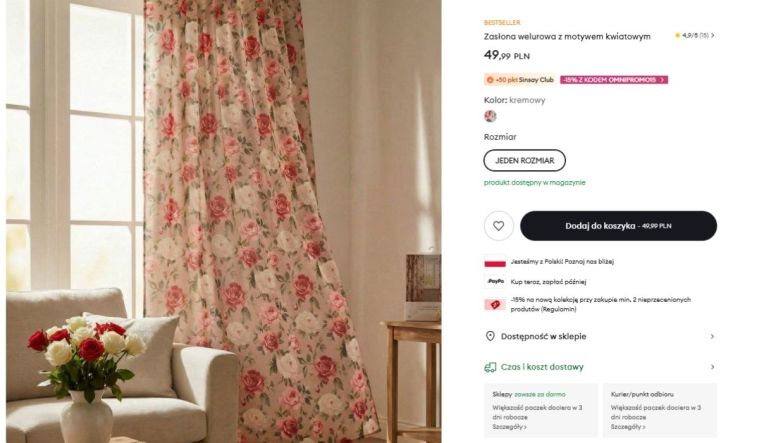Kwiecista zasłona z Sinsay również cieszy się sporą popularnością. Na stronie sklepu zamieszczono 15 opinii na jej temat, a średnia ocen wynosi 4,9/5. Klienci wspominają w nich m.in.: