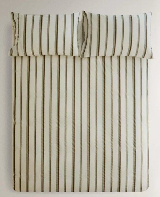 Bardzo zbliżoną stylistycznie propozycję oferuje Zara Home. Poszwa na kołdrę wykonana została z bawełnianego perkalu o gęstości 300 nitek. W praktyce oznacza to gładką, zwartą strukturę tkaniny, która jest jednocześnie przewiewna i przyjemnie chłodna w dotyku. Model w kolorze złamanej bieli z pionowymi paskami posiada kryte zapięcie na guziki u dołu, co nadaje całości bardziej minimalistyczne wykończenie.