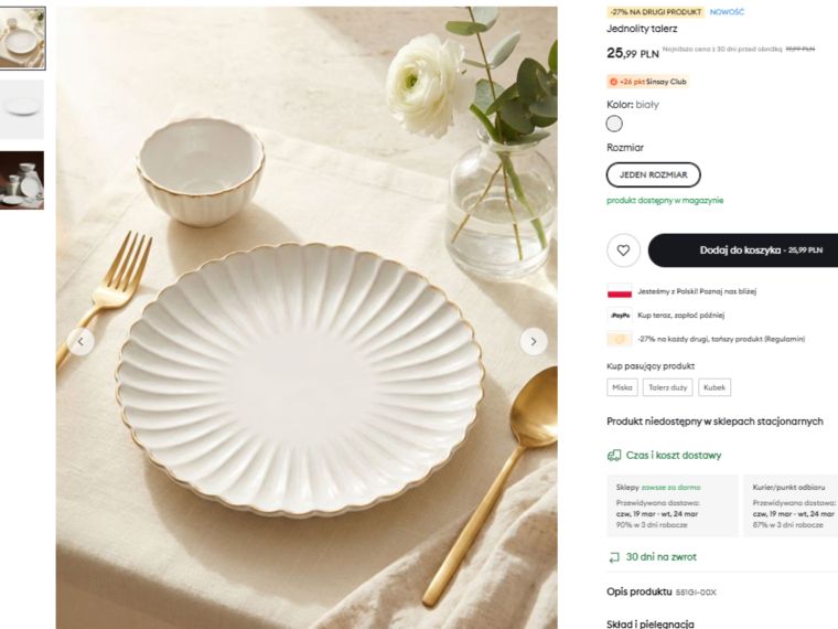 I tu właśnie wchodzi Sinsay, który oferuje bardzo podobny efekt wizualny za ułamek ceny. Za 25,99 zł dostajesz talerz, który na stole wygląda naprawdę stylowo i nie odstaje wizualnie od droższych odpowiedników.